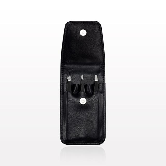 This 3-piece stainless steel tweezer set includes a point tip, slant tip and flat head tweezer, which are all perfect for grooming eyebrows. Stored in a stylish black case with snap closure, this set is ideal for travel and can also be sold at retail or offered as a promotional giveaway.