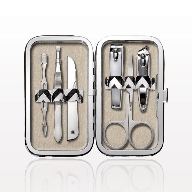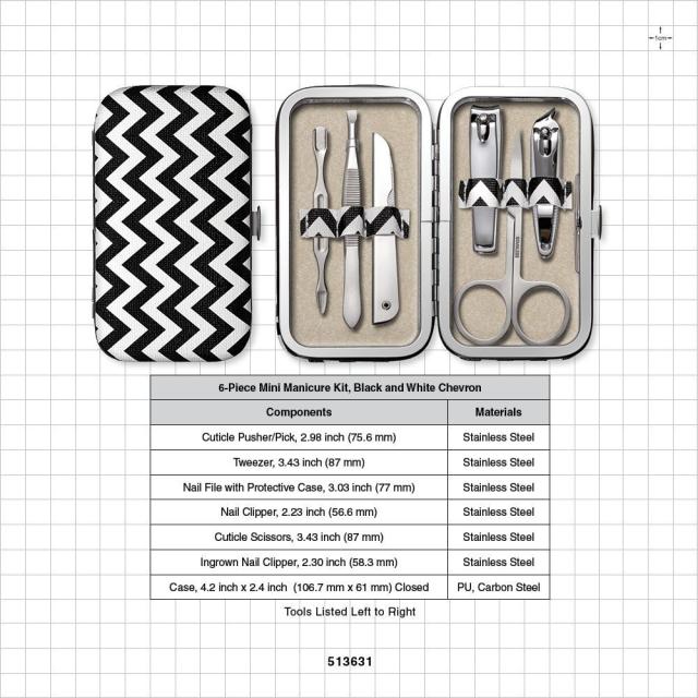 This 6-Piece Mini Manicure Kit includes all your essential manicure tools stored in a stylish black and white chevron case with snap closure. This set includes all stainless steel, high quality tools including a cuticle pusher/pick, tweezer, nail file with protective case, nail clipper, cuticle scissors and an ingrown nail clipper. Convenient for home use or for travel, this versatile manicure kit can also be sold at retail or offered as a promotional giveaway.