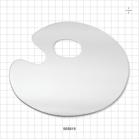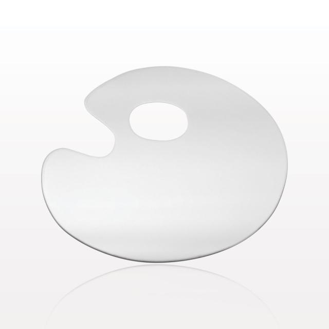 This reusable artist mixing palette made of durable stainless steel with mirror finish offers a sanitary working surface for the professional makeup artist. The thumb hole provides a comfortable grip while mixing, blending and applying cosmetics.