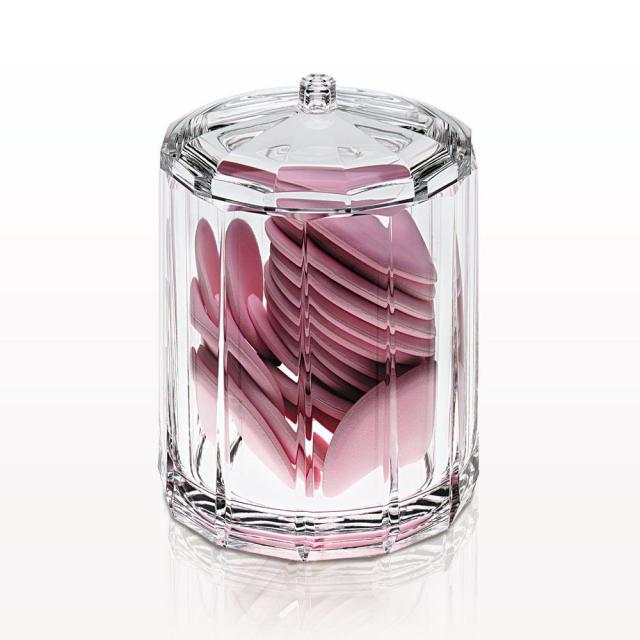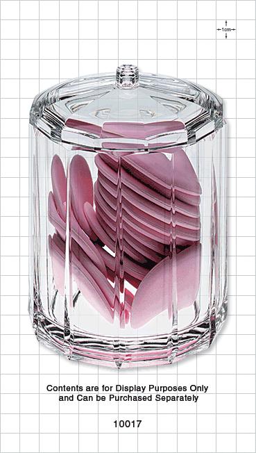 Our luxury faceted acrylic cylinder is suitable for holding swabs and applicators, sponges or cotton balls. The removable lid with molded knob allows for easy access to the contents of this attractive supply container. Use on beauty workspaces, rest room counter tops, or sell these individually boxed acrylics at your own retail counter. Contents are for display purposes only.