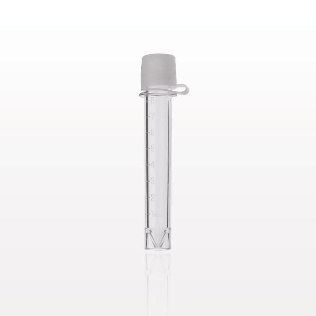 This clear polystyrene 10 ml collection vial comes with a convenient strap-attached white polyethylene screw cap. Its excellent visibility of contents can be used for measurement, mixing or collecting any type of liquid. A self-standing flat bottom makes handling and storage easier, while the attached strap ensures the cap is affixed to the correct vial. The vial has a writing surface for labeling or marking.
