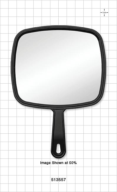 This slim, black, hand held single sided mirror is perfect for showing customers their before and after looks during a makeover. Save space by hanging the mirror on the wall when not in use.