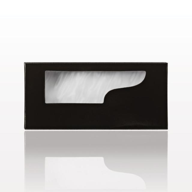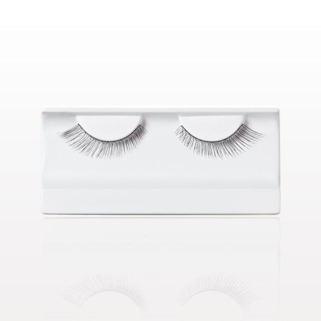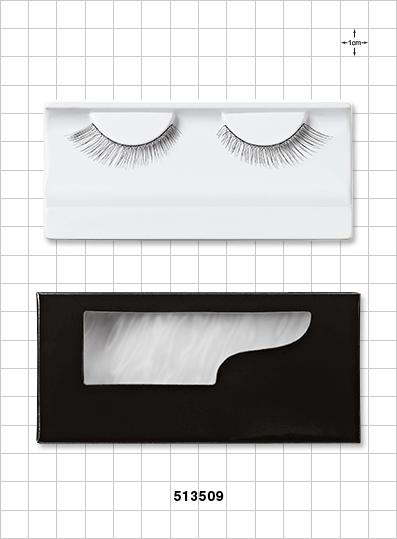 The slightly elongated corners of these false eyelashes will provide a natural flare for a flirty effect. Lashes are presented inside a white tray that fits in an outer black box with see-through window.